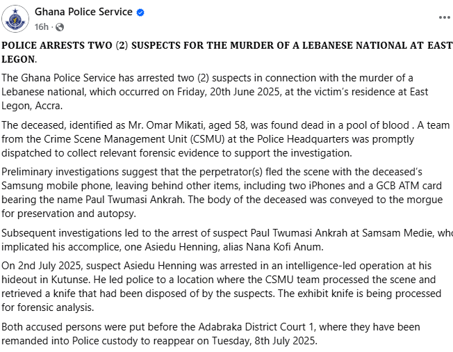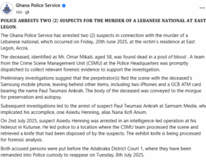 The Police have arrested two suspects in connection with the murder of a 58-year-old Lebanese national, Omar Mikati, at his residence in East Legon in Accra, on Friday, June 20, this year.