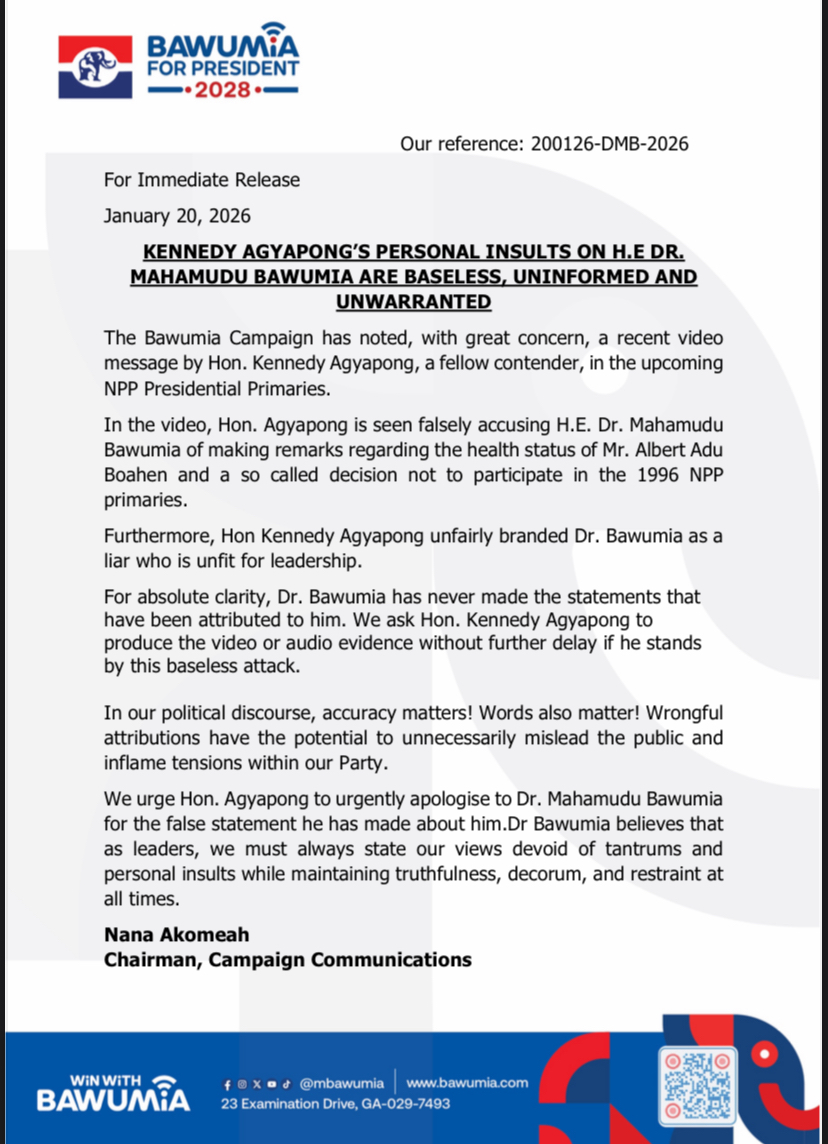 In a statement dated January 20, 2026, the campaign expressed concern over a recent video message in which Hon. Agyapong allegedly accused Dr. Bawumia of making remarks about the health status of the late Mr. Albert Adu Boahen and suggesting a decision not to participate in the 1996 New Patriotic Party (NPP) presidential primaries.