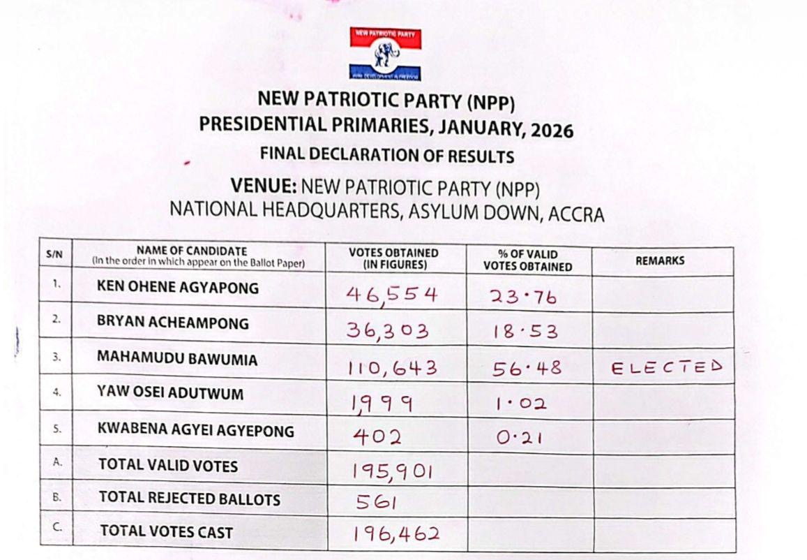 Former Vice President Dr. Mahamudu Bawumia has emerged victorious in the New Patriotic Party’s (NPP) presidential primaries held on Saturday, January 31, 2026, securing a commanding majority of votes cast by delegates nationwide.