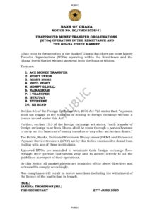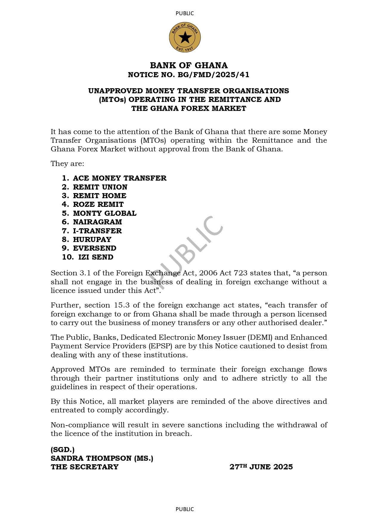 The Bank of Ghana (BoG) has cautioned the public against engaging in  any business transactions with ten  money transfer organisations operating in the remittance and foreign exchange market as they are doing so without regulatory approval of the Bank of Ghana.