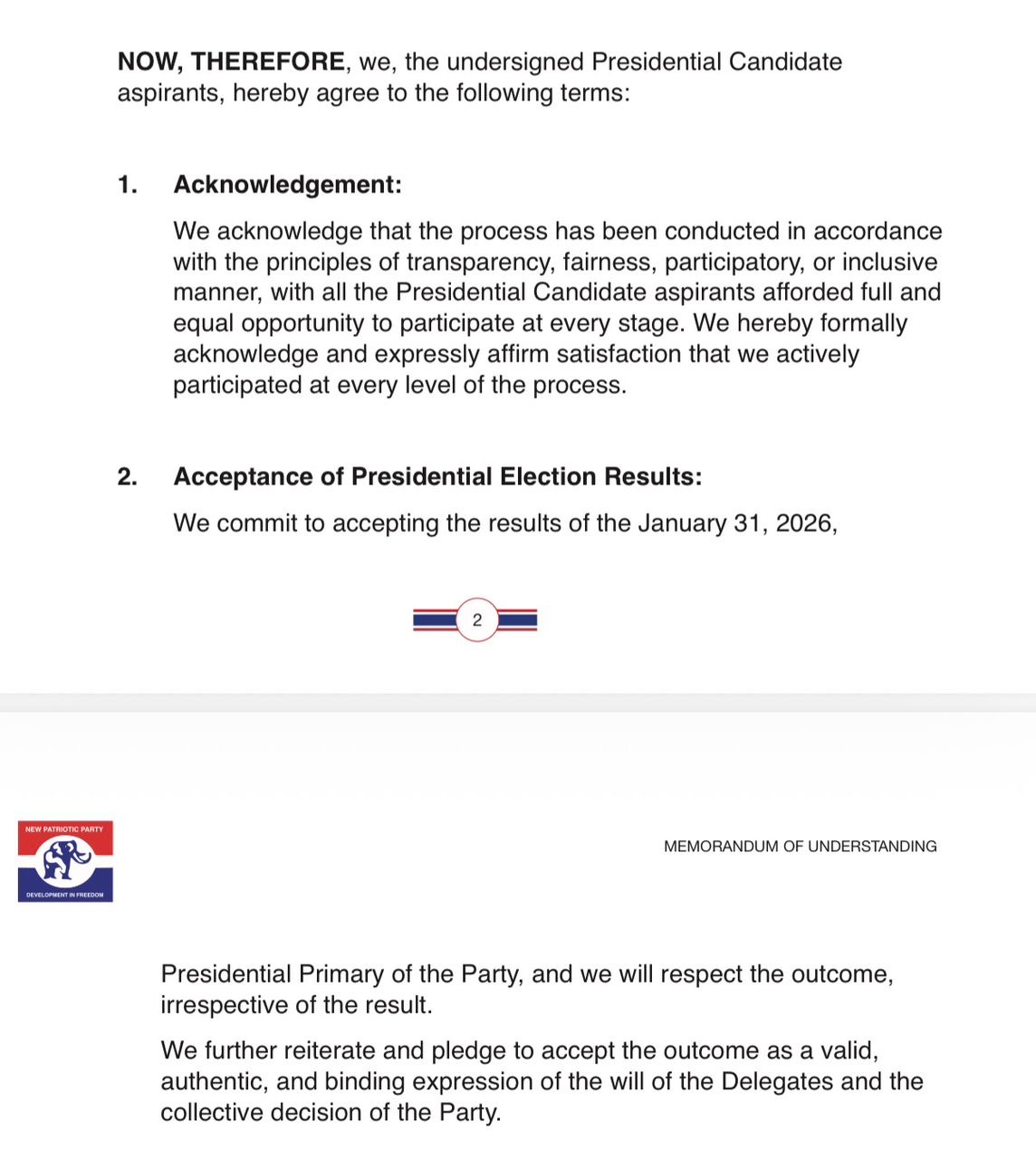 Clause Two of the MoU commits all aspirants to accept the results of the January 31, 2026, presidential primary and to respect the outcome as a valid, authentic, and binding expression of the will of party delegates.