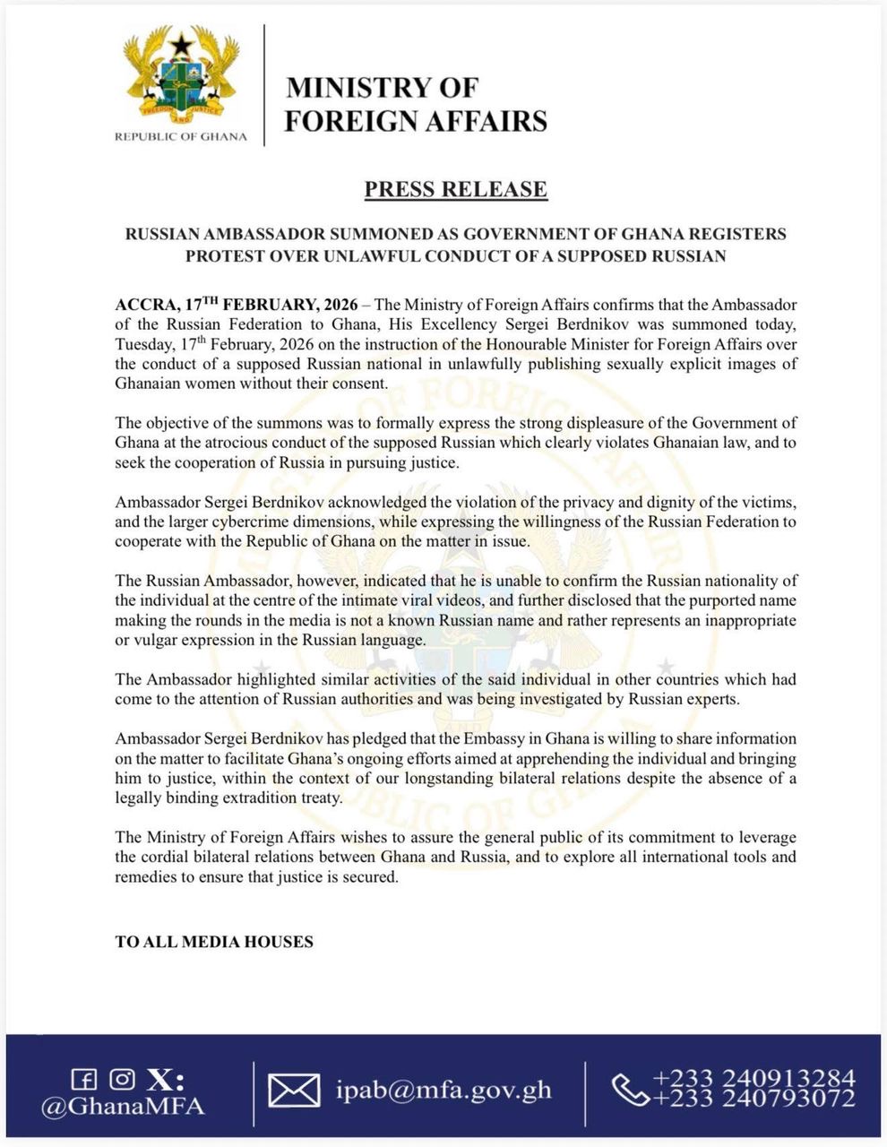 According to the Ministry, the action was intended to express Ghana’s displeasure over what it described as a serious violation of the privacy and dignity of the victims, and to seek the cooperation of Russian authorities in pursuing justice.