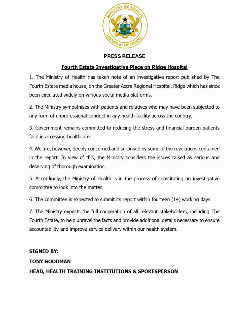 The Ministry of Health has ordered a full investigation into allegations raised in an investigative report by The Fourth Estate on the Greater Accra Regional Hospital, popularly known as Ridge Hospital.