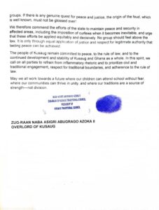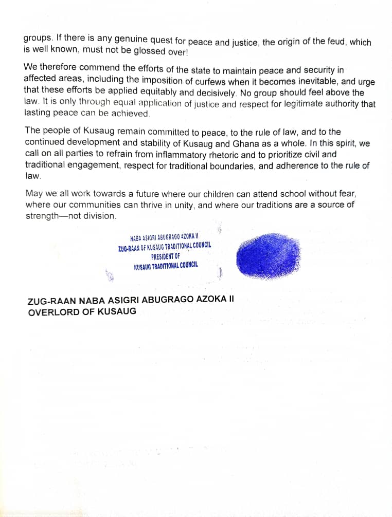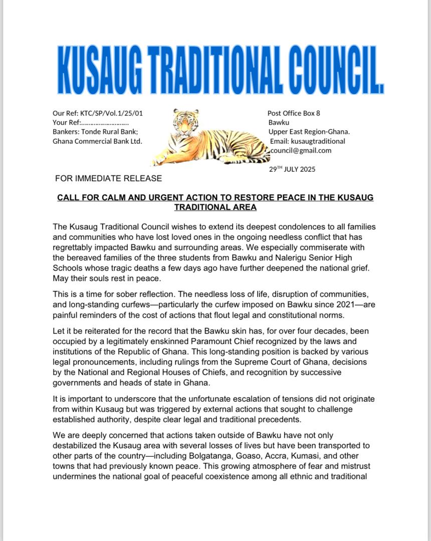 In a statement dated July 29, 2025, and signed by Zug-Raan Naba Asigri Abugrago Azoka II, the Overlord of Kusaug, the Council expressed condolences to bereaved families and condemned the needless conflict that continues to disrupt communities and claim lives in the region.