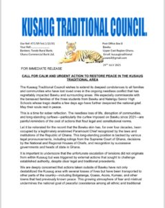 The Kusaug Traditional Council has issued an appeal for calm and urgent steps to restore peace in the Bawku area, following recent incidents of violence that claimed the lives of three students from Bawku and Nalerigu Senior High Schools.