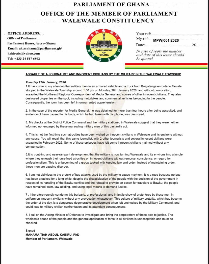 In a statement dated Tuesday, January 27, 2026, the MP alleged that soldiers travelling in an armoured vehicle and a military truck from Bolgatanga to Tamale stopped in Walewale around 1:00 p.m. on Monday, January 26, 2026, and, without provocation, assaulted the Northeast Regional Correspondent of Media General and other residents.