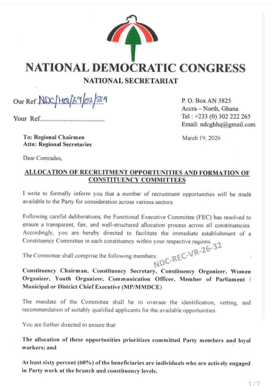 The National Secretariat of the National Democratic Congress (NDC) has announced a structured plan to allocate recruitment opportunities within the party, alongside a directive to establish constituency-level committees across the country.