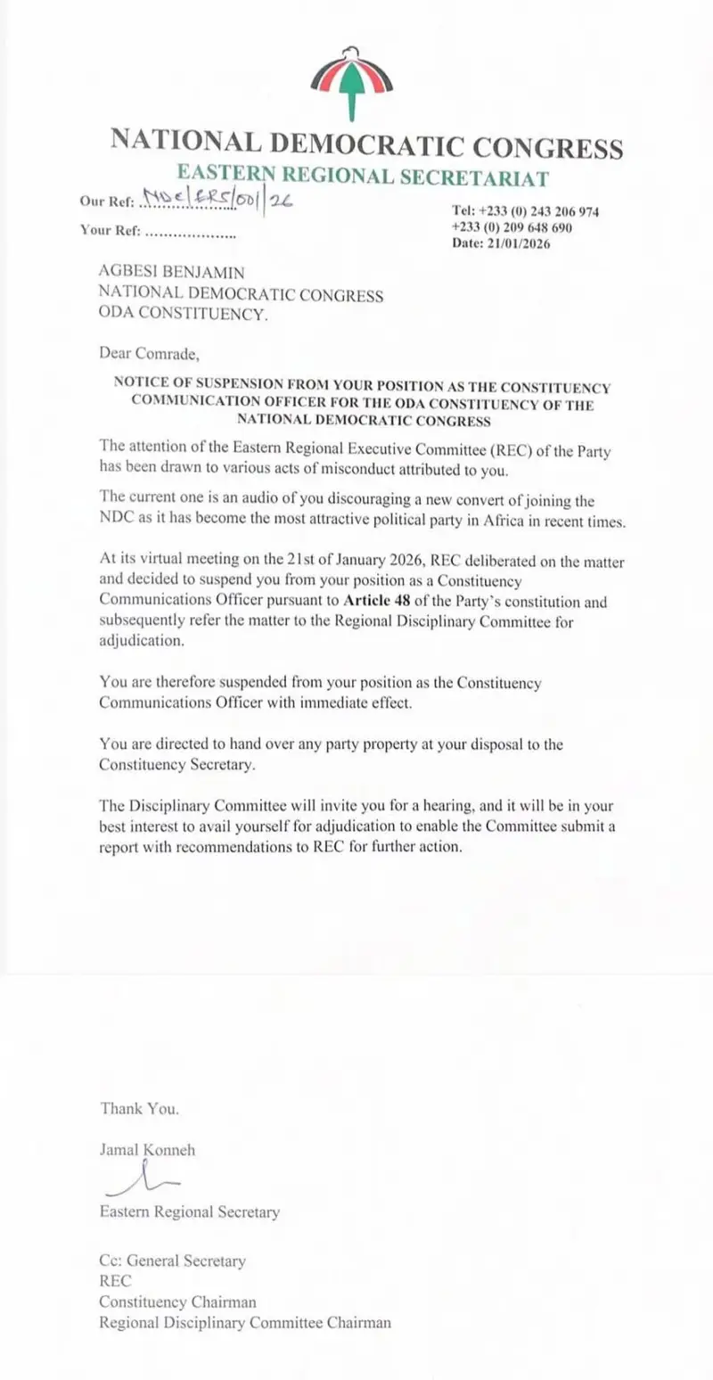 The Eastern Regional Executive Committee (REC) of the National Democratic Congress (NDC) has suspended the Oda Constituency Communication Officer, Agbesi Benjamin, over allegations of misconduct linked to a widely circulated audio recording.