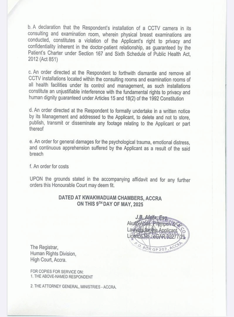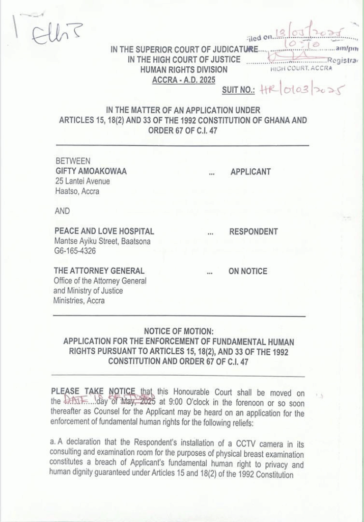 A patient, Gifty Amoakowaa has initiated legal action against a healthcare provider, Peace and Love Hospital, challenging the installation of CCTV cameras in medical consultation and examination rooms used for physical breast examinations, citing it as a violation of her fundamental rights.
