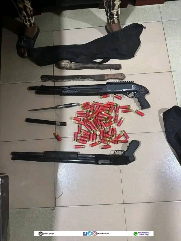 According to the police, “Exhibits retrieved from the suspect include two pump-action guns with 64 rounds of AA ammunition, a cutlass, a knife, and an ammunition vest.”