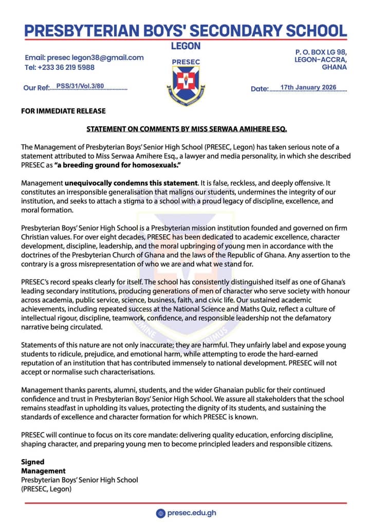 The Management of Presbyterian Boys’ Senior High School (PRESEC), Legon, has strongly condemned comments attributed to lawyer and media personality, Miss Serwaa Amihere, in which she allegedly described the school as “a breeding ground for homosexuals.”