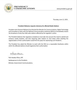 In a directive to the Minister for Communications, Digital Technology and Innovation, President Mahama requested a collaboration between the ministry and the NCA to ensure the affected stations resume broadcasting without delay.