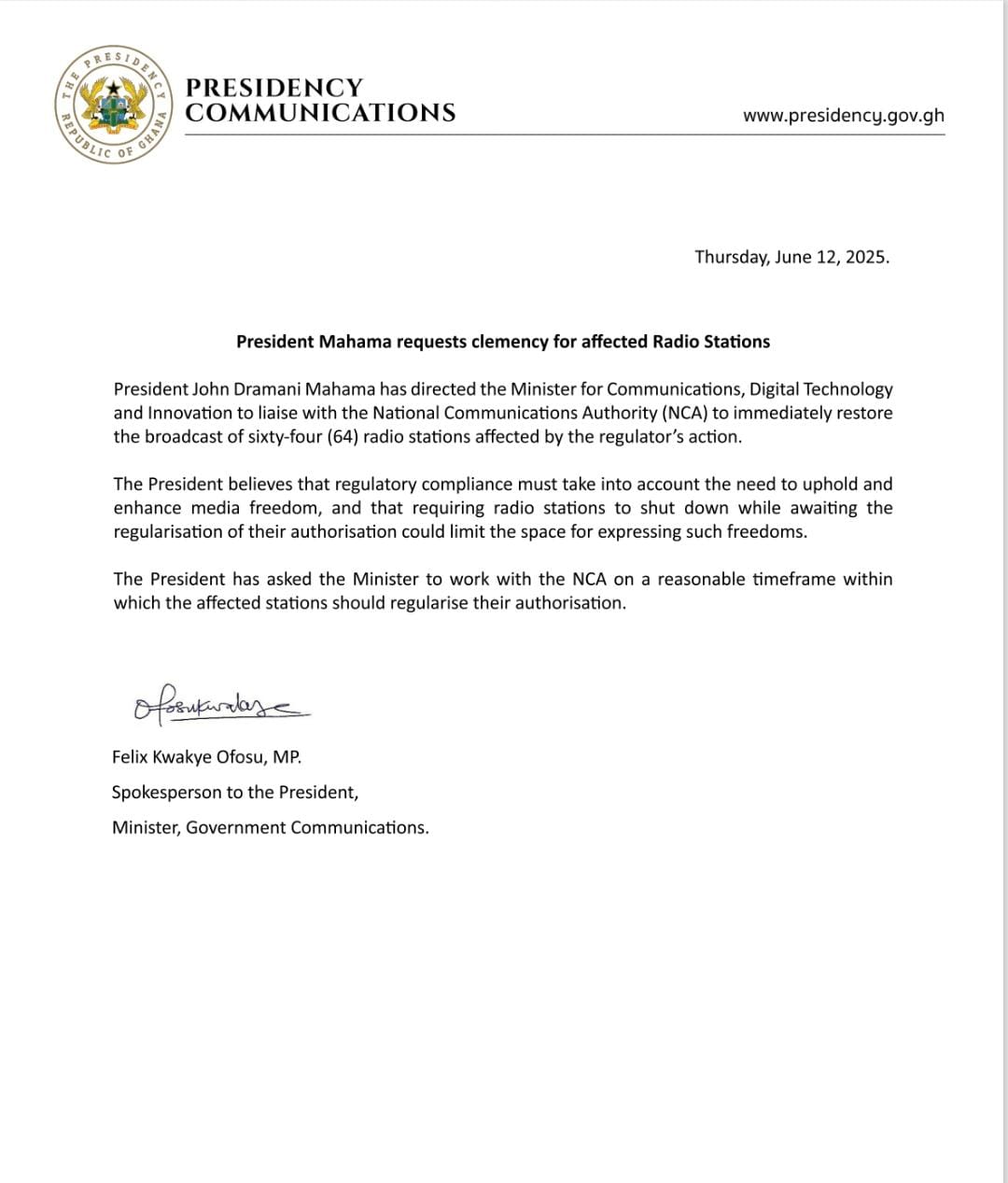 President John Dramani Mahama has called for the immediate restoration of broadcast services to 64 radio stations shut down by the National Communications Authority (NCA) for regulatory breaches.