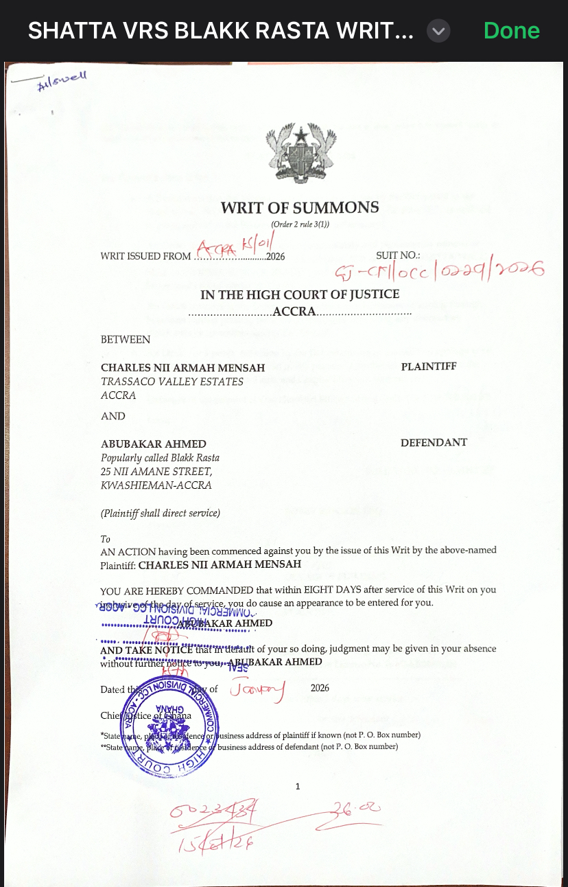 Dancehall artiste and businessman Charles Nii Armah Mensah, popularly known as Shatta Wale, has filed a GH₵100 million defamation suit against social commentator Abubakar Ahmed, widely known as Blakk Rasta, at the High Court in Accra.
