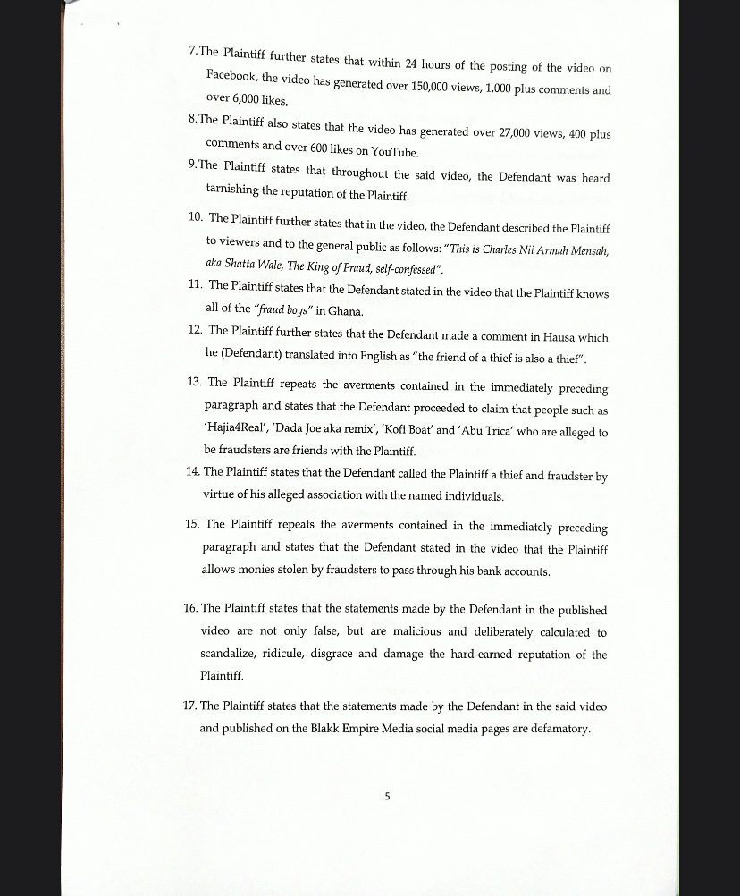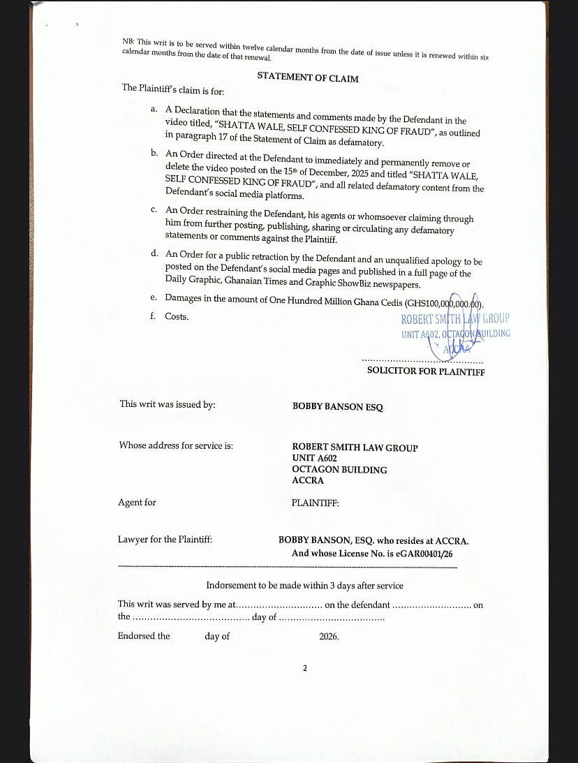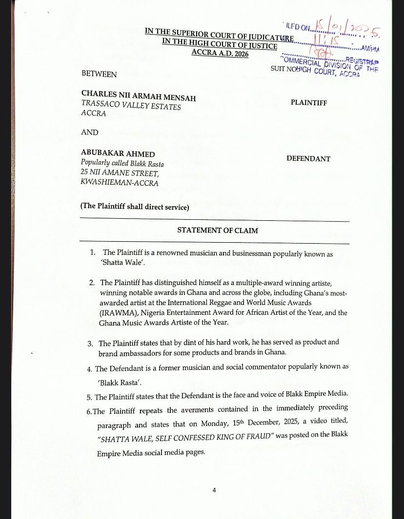 The suit arises from a video posted on Blakk Empire Media’s social media platforms on December 15, 2025, titled “Shatta Wale, self-confessed king of fraud.” According to the statement of claim, Shatta Wale contends that the comments made in the video were false, malicious and calculated to damage his reputation.