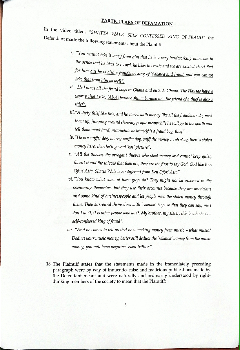 Shatta Wale further states that the defendant alleged he associates with known fraudsters and allows stolen funds to pass through his bank accounts, claims the musician says are baseless and defamatory. He asserts that the publication has caused him reputational harm, anxiety among his family, fans and business partners, and damage to his career as a public figure.