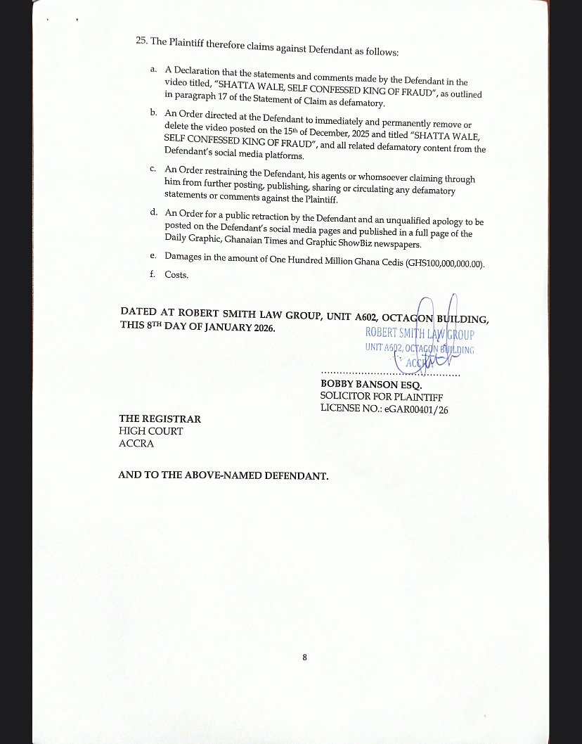 Shatta Wale is also asking the court to order a public retraction and an unqualified apology to be published on the defendant’s social media pages and in full-page publications in the Daily Graphic, Ghanaian Times and Graphic ShowBiz. Additionally, he is claiming GH₵100 million in damages, along with costs.