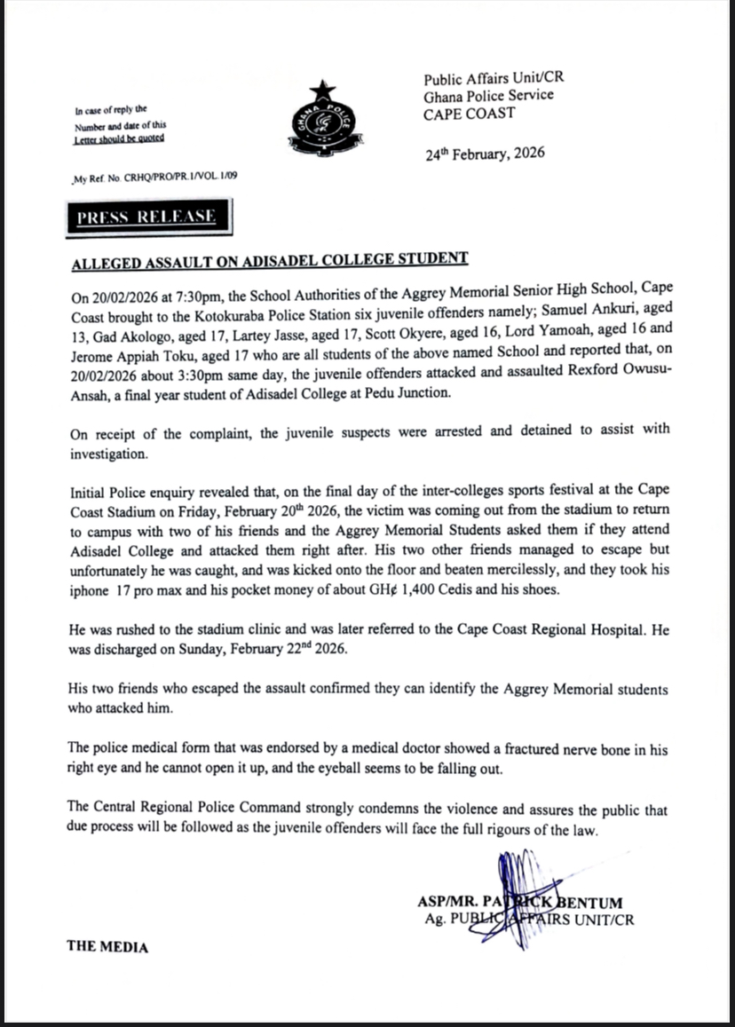 According to a press release issued by the Ghana Police Service Public Affairs Unit in Cape Coast on February 24, 2026, the suspects, all juveniles aged between 13 and 17 years, were handed over to police authorities by school officials to assist with investigations.