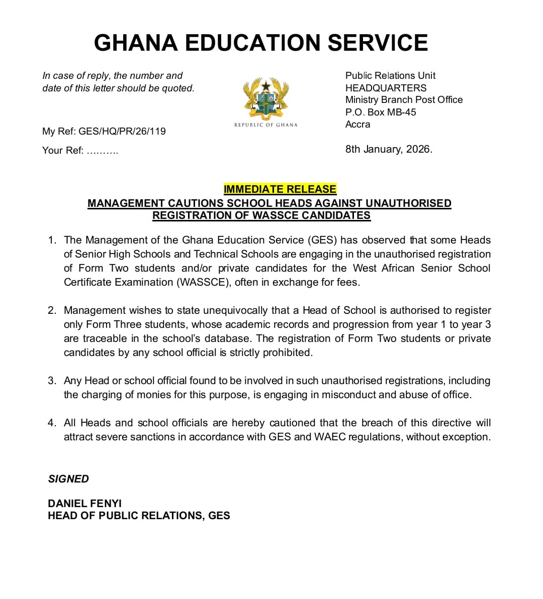 The Service cautioned all school heads and officials that breaches of this directive will attract severe sanctions, in line with GES and WAEC regulations, without exception.